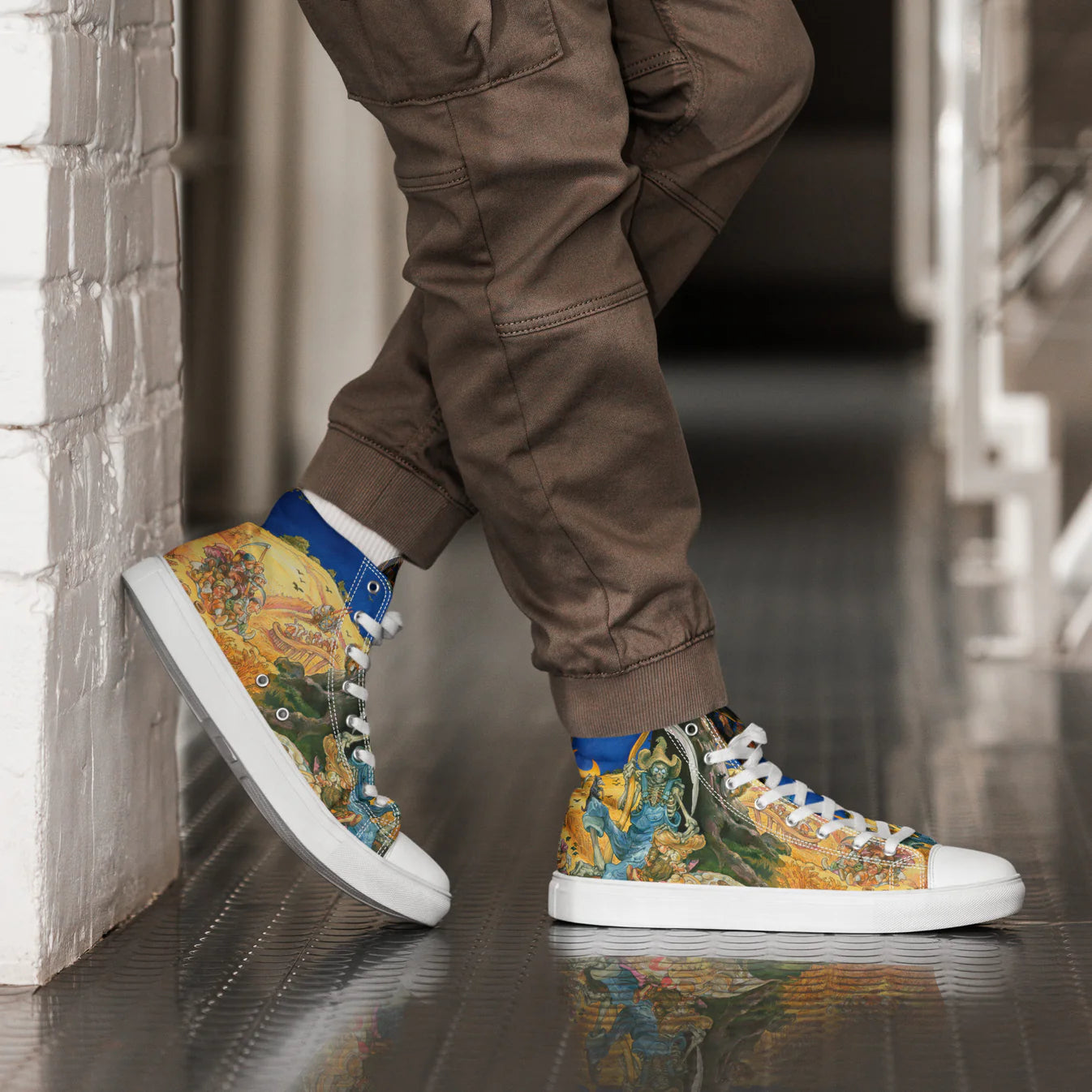 Rock the round world with these iconic High Top Canvas Shoes! These handmade, shoes featuring the art of Josh Kirby are sure to stand out. Get yours now!